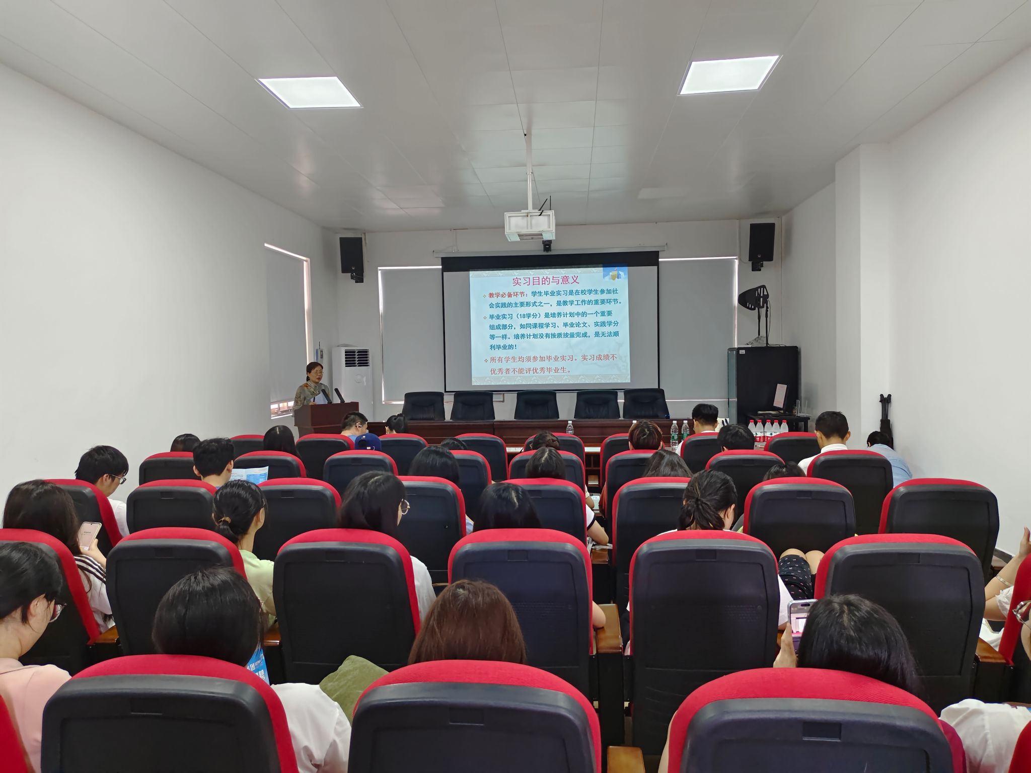 宾冬梅老师随后详细介绍了实习的具体安排,包括实习流程、注意事项以及实习结束后需提交的实习材料等。她特别强调了实习期间的安全问题,提醒学生们要严格遵守实习单位的规章制度,保障个人安全。