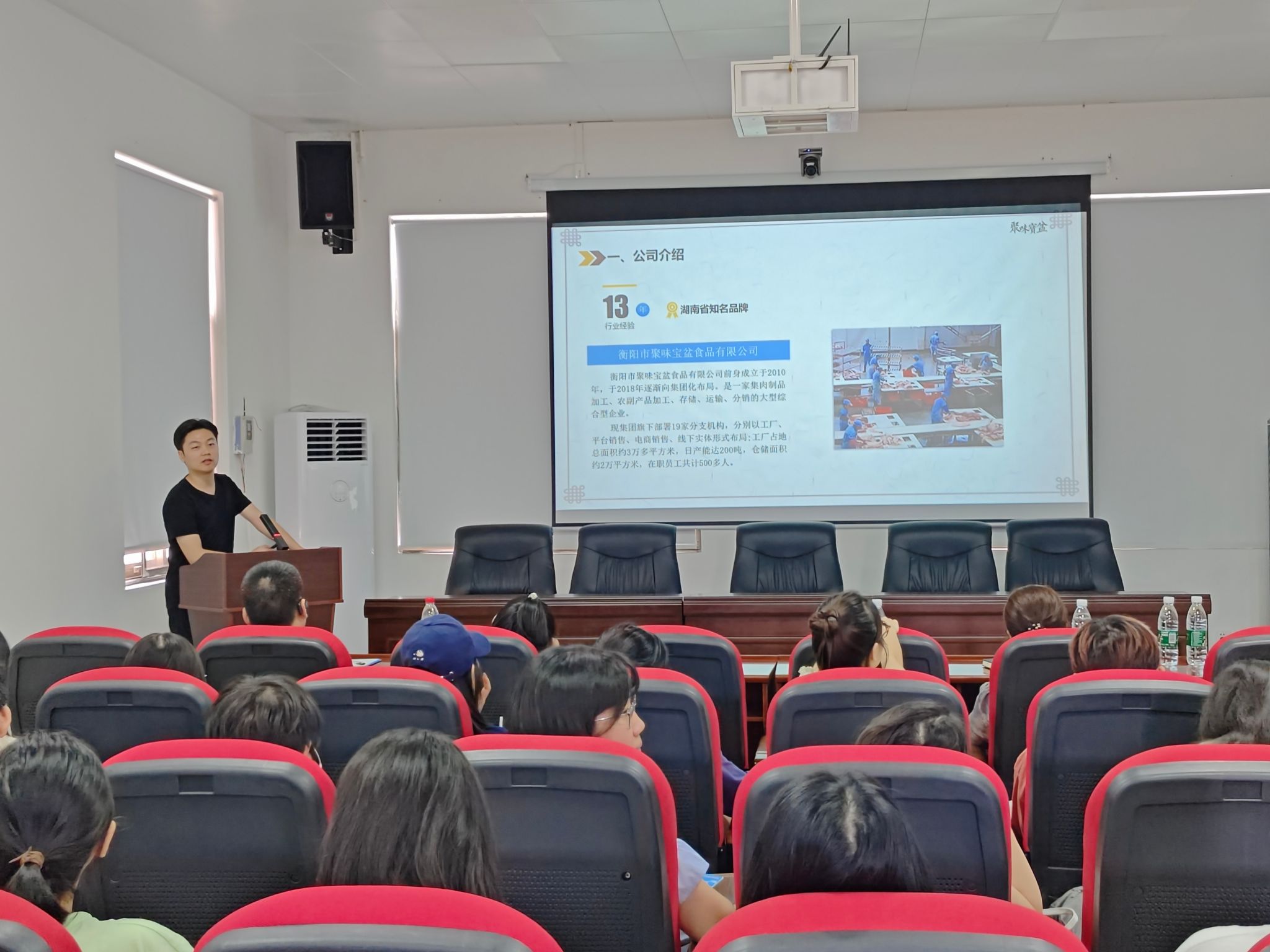 正大饲料(衡阳)有限公司喻总和聚味宝盆集团袁总分别进行了企业宣讲,介绍了公司文化、产品、荣誉及人才培养策略,并提供了实习岗位信息及待遇,为学生的职业发展提供了指导。
