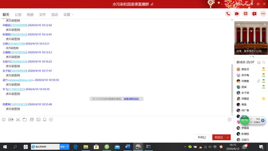 为了高效开展网络教学,提高教学质量,发挥网络教学资源优势,克服网络教学中无法面对面交流、无法及时了解课堂学习效果等劣势。主要采用以下几项措施:(1)制定教学计划,教学大纲,教学进度计划。针对疫情期间制定教学计划,教学进度计划,有组织实施教学,让学生了解课程教学内容,教学重点,难点,教学进度,有计划完成任务;(2)课前课后打卡。每一堂课前课后打卡,督促学生按时听课。学生每次课都能按时参与听课;(3)课堂效果评估。对课程内容布置作业,对作业进行查阅、评价、鼓励。每天对作业情况进行总结,评出优秀者,群里表扬,树立榜样。(4)认真答疑。鼓励学生提问,对学生提出的问题,认真解答。(5)用好网络资源。充分利用MOOC、直播课程、优质课程及结合本人课件学习。