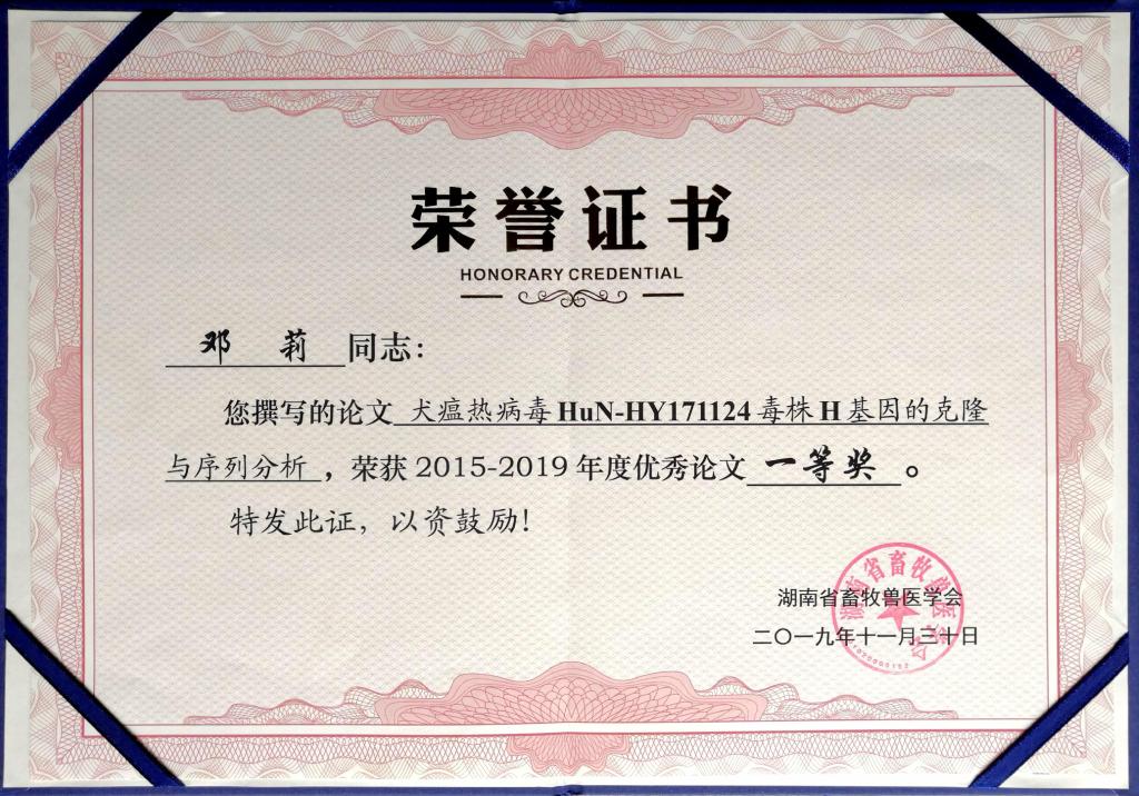 今年是新中国成立70周年,为激励大家在新的起点上取得更大进步,大会评选了2015-2019年度优秀学术论文。申搏官网2016级生物科学专业学生邓莉撰写的论文《犬瘟热病毒HuN-HY171124毒株H基因的克隆与序列分析》荣获一等奖。
