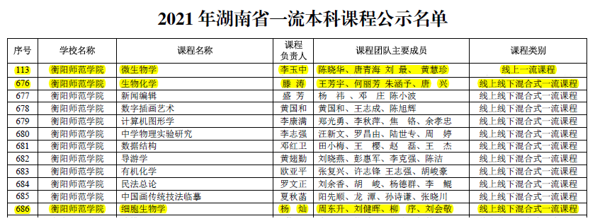 湖南省教育厅于11月24日公布了2021年省级一流本科课程评审认定结果,申搏官网3门课程顺利通过评审被认定为省级一流本科课程,分别是李玉中老师负责的微生物学线上一流课程,杨灿老师负责的细胞生物学线上线下混合式一流课程以及滕涛老师负责的生物化学线上线下混合式一流课程。