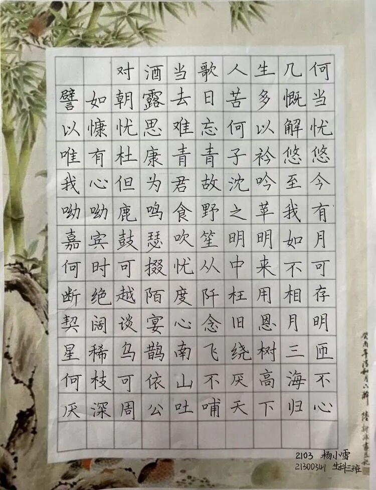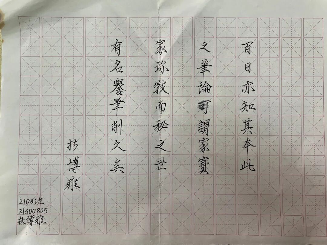 在日常教学中,教师的板书就是学生典范,一笔一画都给学生起着榜样作用。申搏官网始终注重师范生的书法,科技创新卓越师范班的同学们在开课期间认真学习书法,交上来的作品各具特色,或舒展大方、清秀雅致,或苍劲有力、入木三分,看起来韵味十足,展现了扎实的书写基本功。
