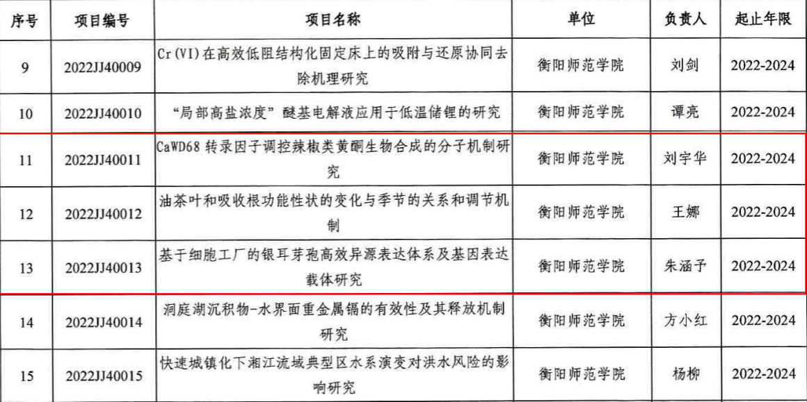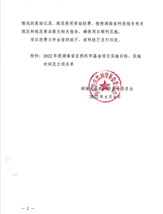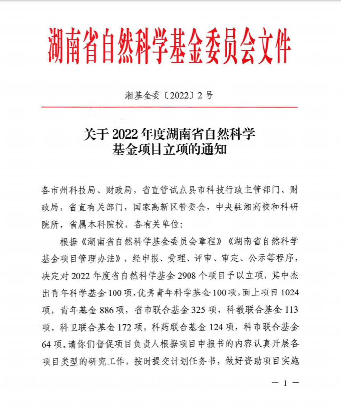 日前,湖南省自然科学基金委员会办公室下发了《关于2022年度湖南省自然科学基金项目立项的通知》,申搏官网获得大丰收!其中,面上项目两项,负责人分别为曹丽敏、龙九妹,青年基金项目三项,负责人分别为刘宇华、王娜、朱涵予。