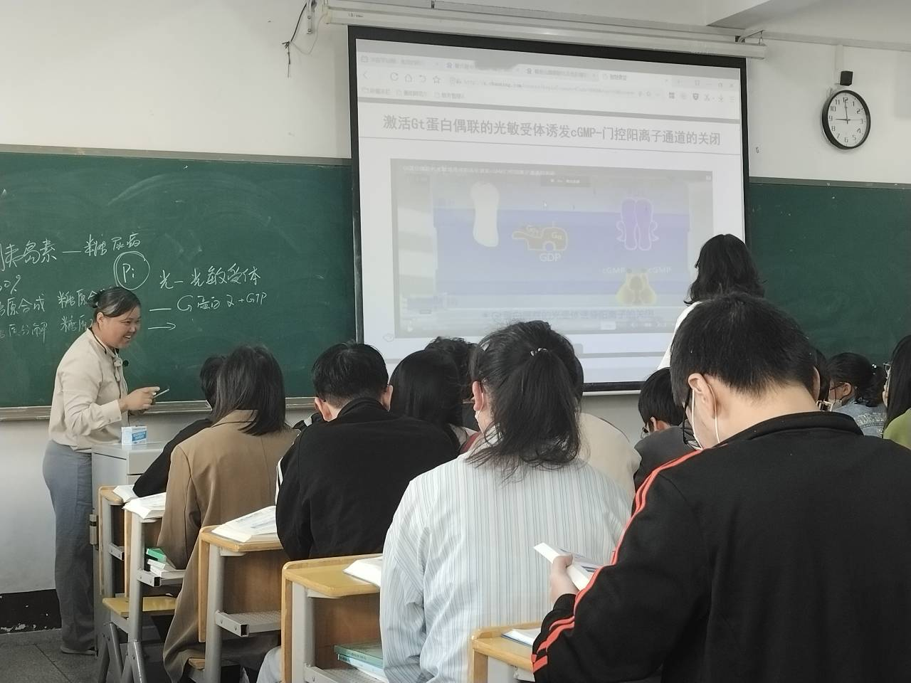 10月19日上午,西校区知行楼319室,在杨灿博士主讲的《生物细胞学》课堂上,除了认真听讲的学生,还来了一批特殊的“客人”,生科学院10余名专业教师前来听课。上课伊始,杨灿老师以数个生活中的常见现象为引线,将同学们缓缓导入《细胞生物学》课程,讲述概念时,字正腔圆,不偏不倚,列举实例时,娓娓道来,气氛活跃,让同学们在轻松的氛围中快乐学习。在上课的过程中,杨灿老师还设置了抢答和随机抽查的环节,让同学们积极参与课堂互动,增强教师教学的针对性和学生学习的主体性。