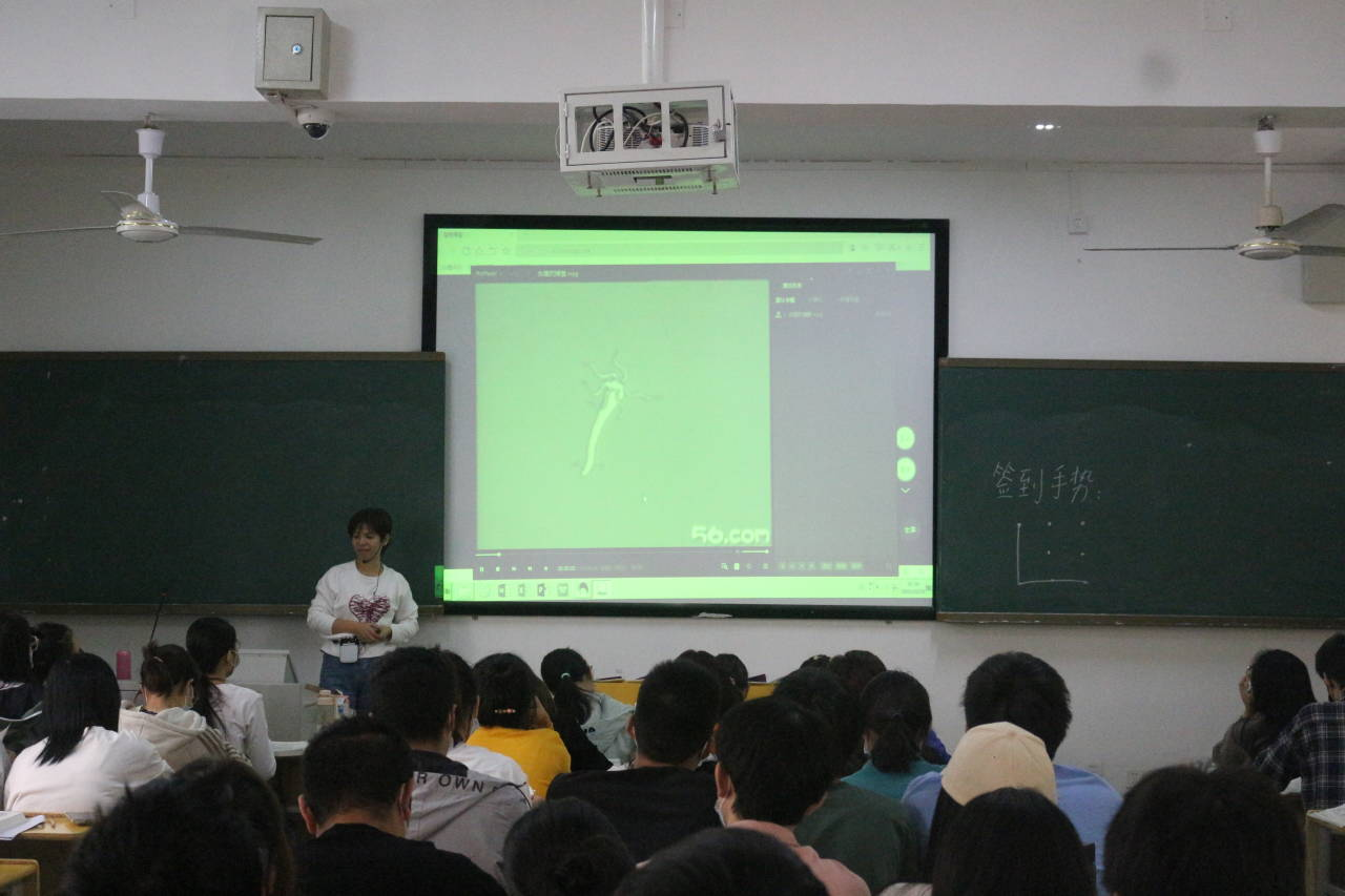 唐姣玉老师的《动物学》课堂上,播放的一段有关腔肠动物的小短片瞬间把同学们融进课程内容。在上课的过程中,唐姣玉老师全程保持微笑,结合生活日常,耐心的讲解各个知识点,课堂氛围轻松有趣。她还利用自制的教具给同学们展示,利用可视、直观的教具辅助教学,起到了很好的作用。