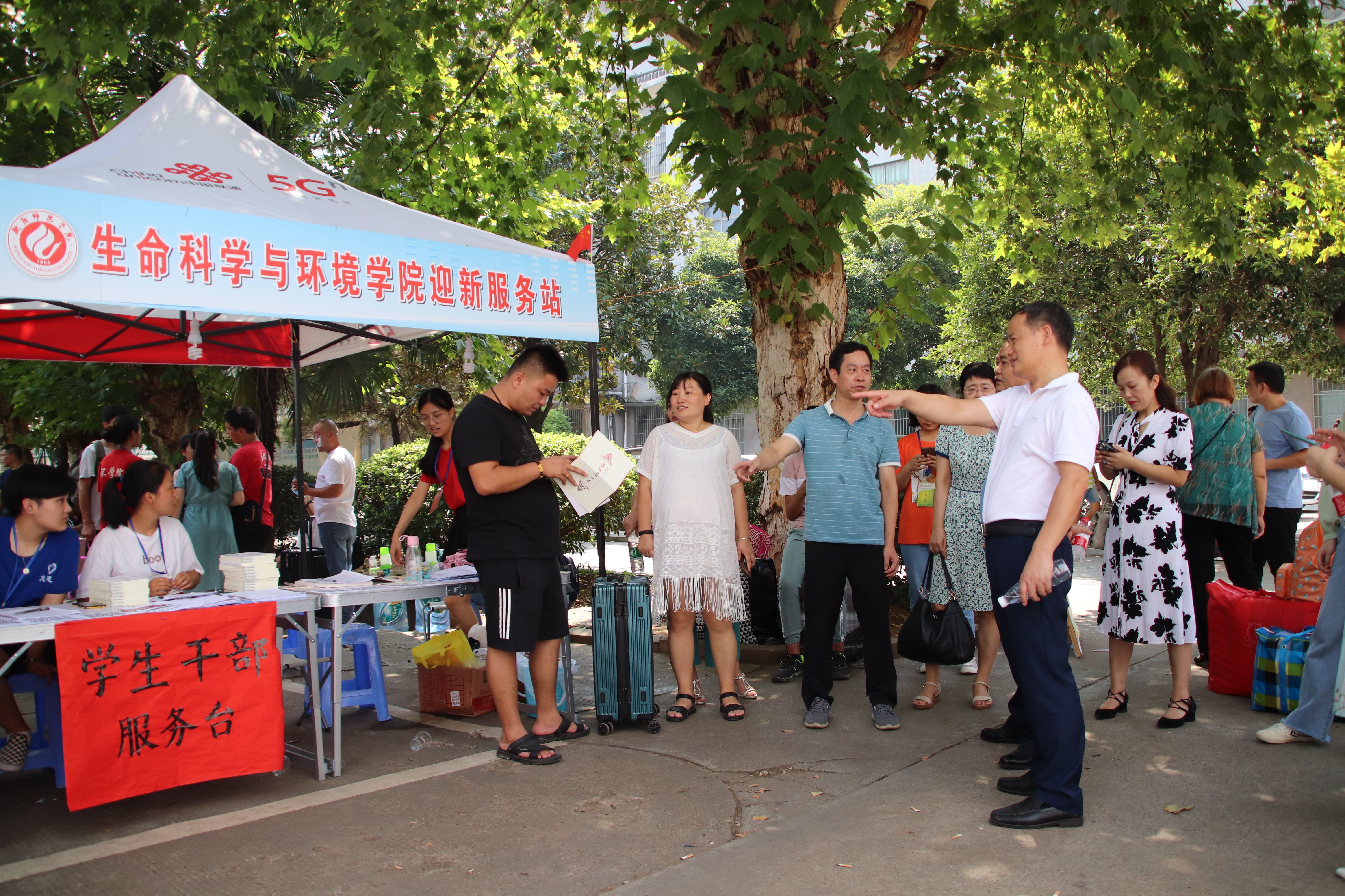 炎炎夏日,学院迎新站台设有家长休息区,以供不远万里送孩子来上学的家长稍作休息。志愿者贴心接待家长,及时送上饮用水,介绍学院专业,就业、考研情况,耐心解答家长的疑问。