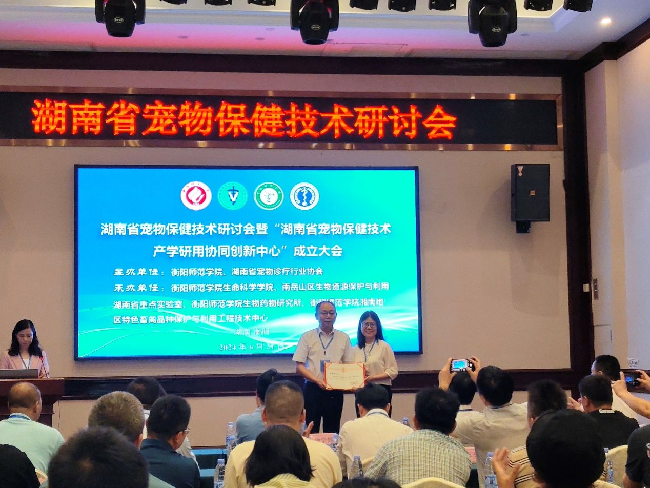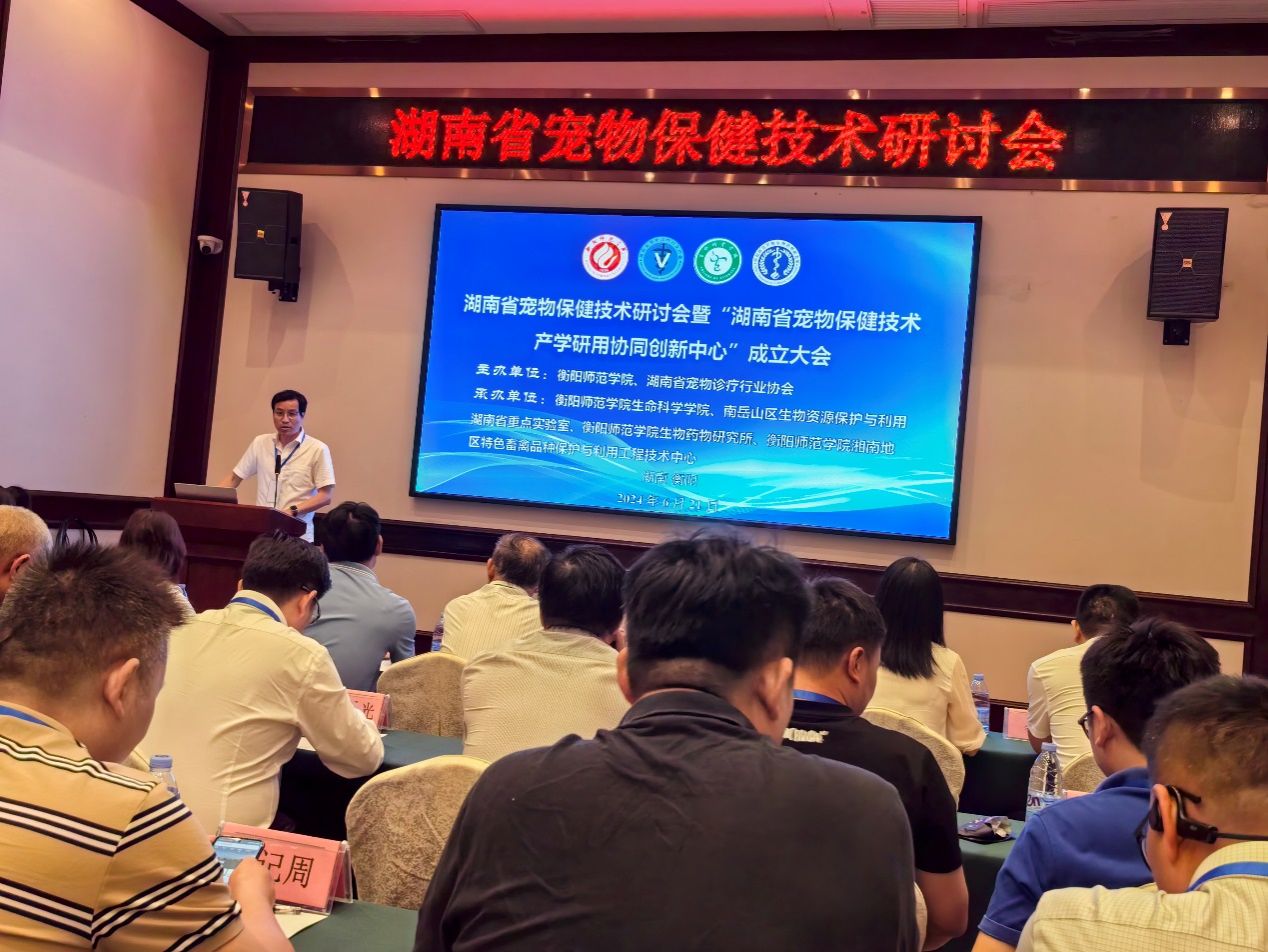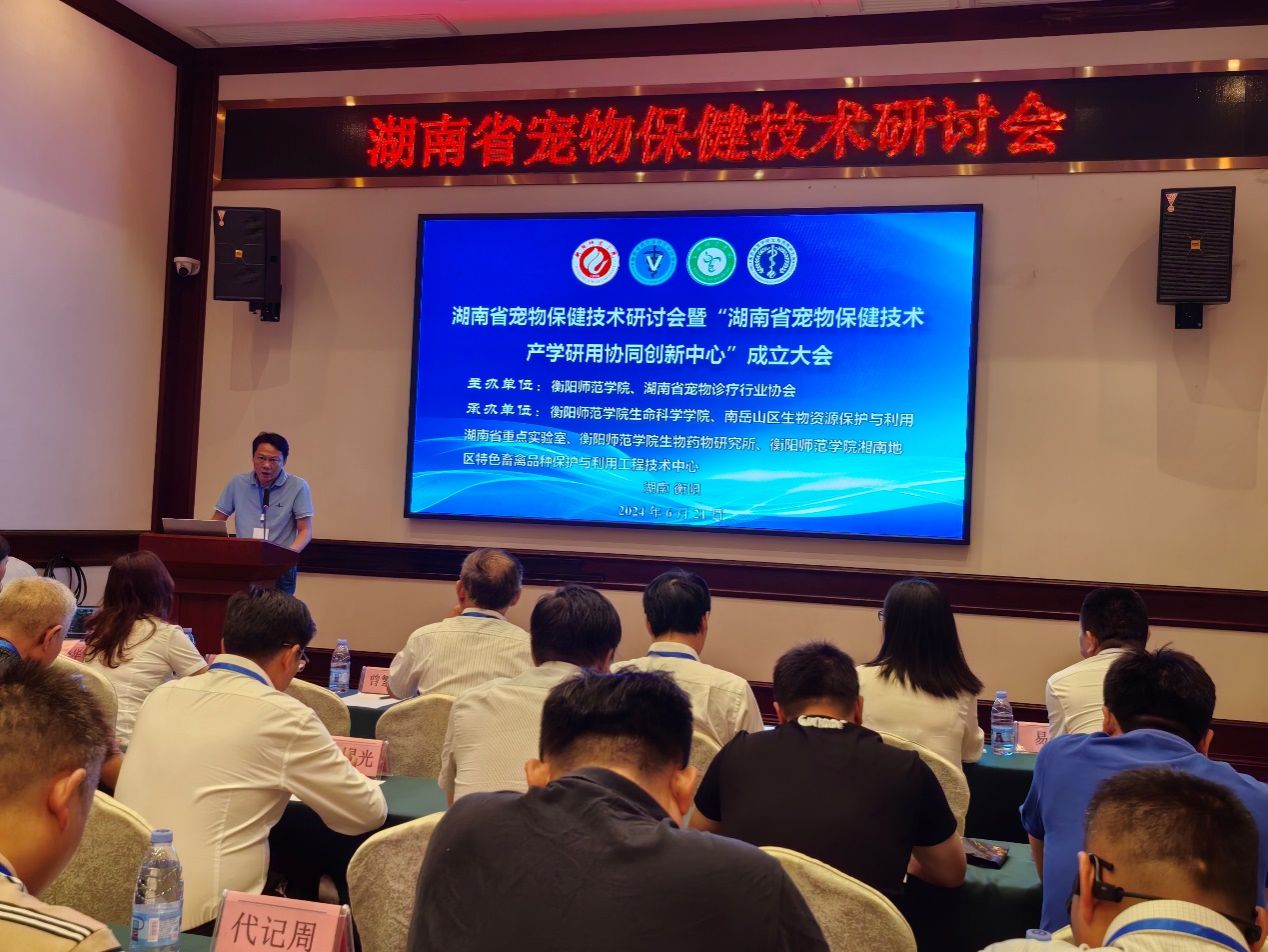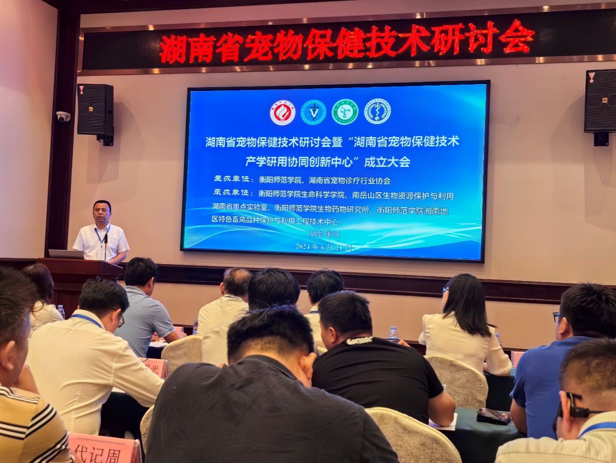 湖南省宠物保健技术研讨会暨“湖南省宠物保健技术产学研用协同创新中心”成立大会于2024年6月21日在衡阳市召开。本次会议由SUNBET申搏官方网站和湖南省宠物诊疗行业协会联合主办,由SUNBET申搏官方网站、南岳山区生物资源保护与利用湖南省重点实验室和SUNBET申搏官方网站生物药物研究所、SUNBET申搏官方网站湘南地区特色畜禽品种保护与利用工程技术中心联合承办。湖南省宠物诊疗行业协会会长钟学辉、秘书长胡锡光、副会长袁焕新、副会长赵道贵、衡阳市畜牧水产事务中心副主任曾繁荣、SUNBET申搏官方网站科研处处长邓运员教授、SUNBET申搏官方网站合作发展与校友联络中心主任陈梅香、SUNBET申搏官方网站现代教育发展学院院长唐斯萍教授、SUNBET申搏官方网站院长易诚教授、副院长杨海教授、副院长陈晓华博士、南岳山区生物资源保护与利用湖南省重点实验室常务副主任唐青海教授及湖南省宠物医疗、保健、食品行业的专家、行业企业代表及高校师生参加了本次会议。