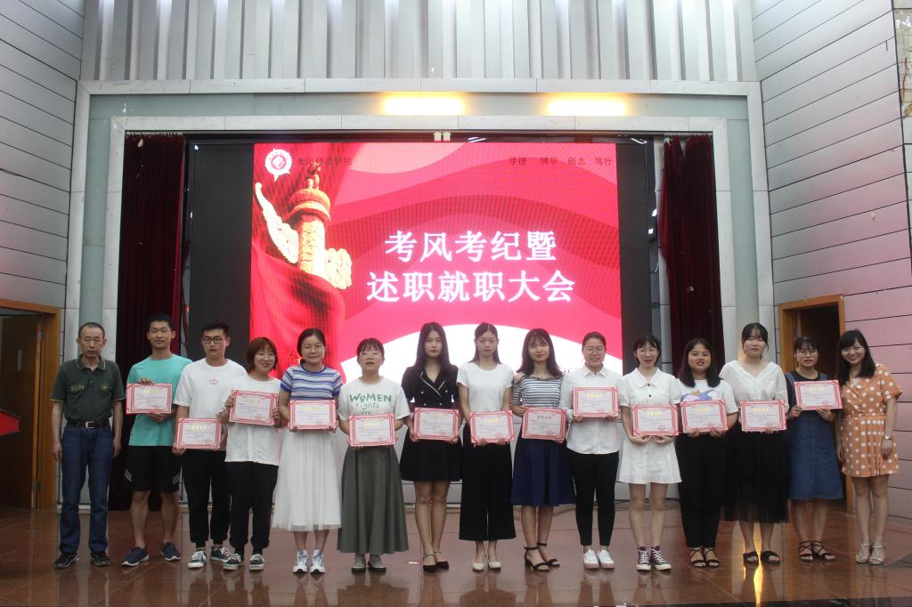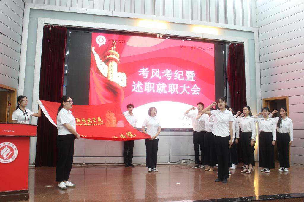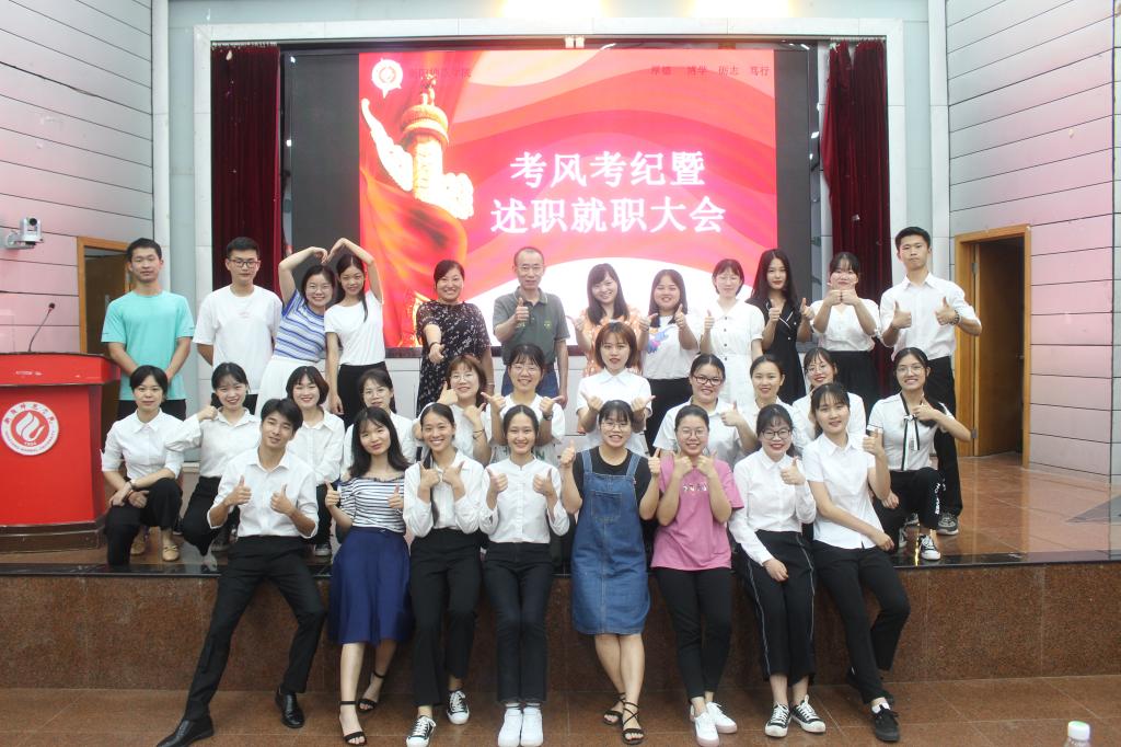 6月26日晚七点,SUNBET申搏官方网站生命科学与环境学院2019年上学期考风考纪暨学生干部述职就职大会在西校区模拟法庭顺利召开。党总支书记刘艳波,团委书记刘树芬,辅导员老师许若霏出席本次大会。