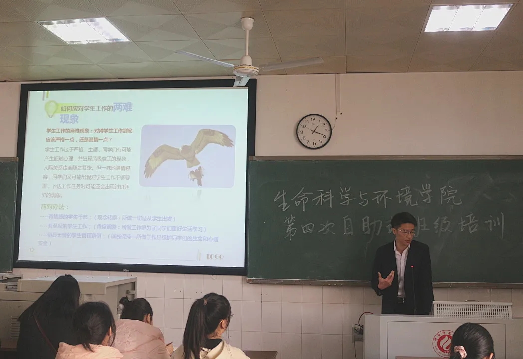 为提高学生干部的综合素质,使其能更好地服务学院、服务同学,申搏官网于2021年11月23日中午12:50,在外语楼301召开生命科学与环境学院自助式班级学生干部第四次培训讲座,唐乾翔老师为申搏官网学生干部进行培训。参加此次培训的有全体学生会成员和各班班委。