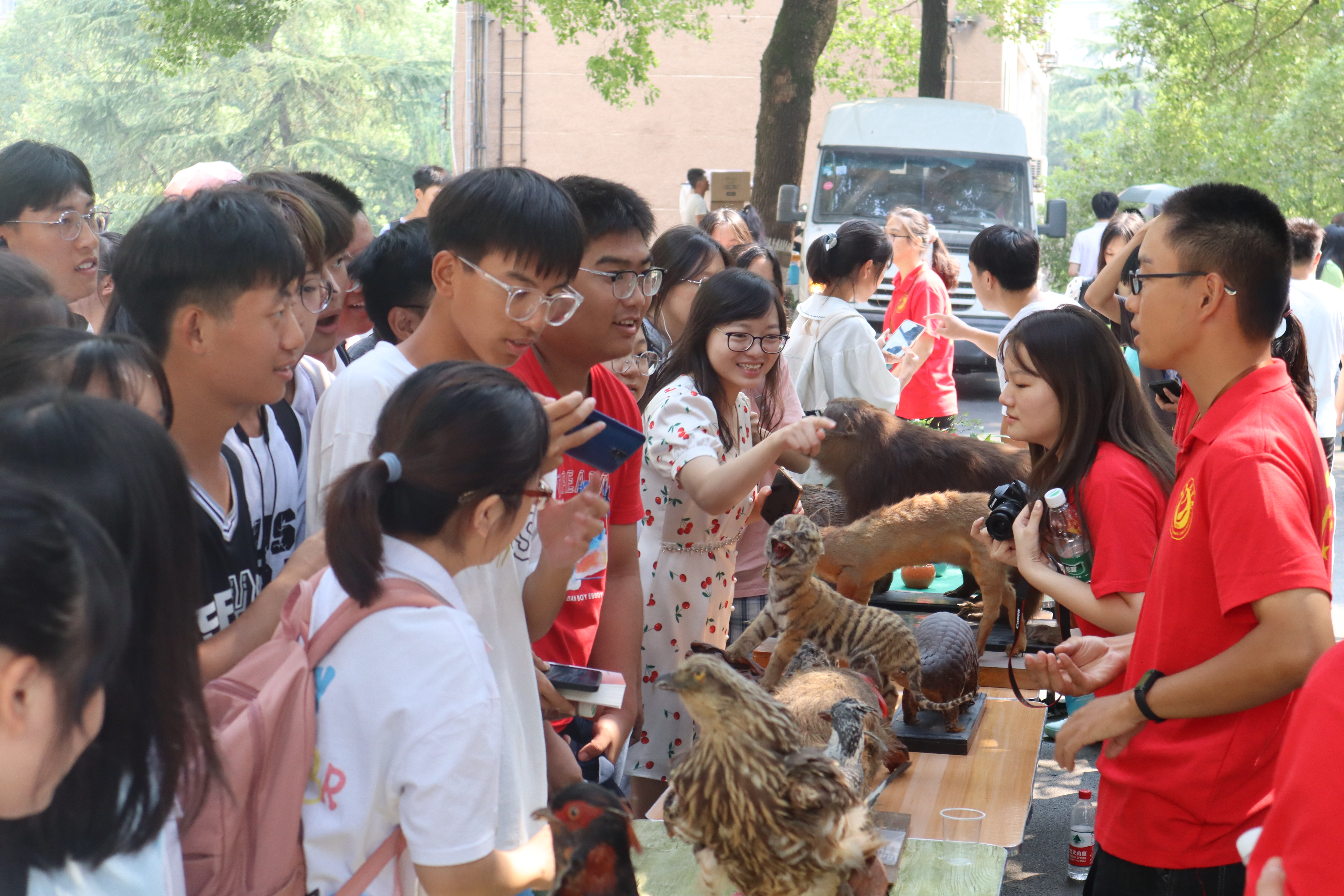 在动植物标本展示区,70余件野生动物标本、40余幅珍稀植物标本、20余盆盆栽植物向大家热情问候。威风凛凛的华南虎、毛发蓬松的黄鼬、仙风道骨的丹顶鹤、天真无邪的穿山甲、森然欲博人的大猩猩……形态各异、栩栩如生的动物标本涵盖两栖动物、爬行动物、鸟类、哺乳动物,让人仿佛置身丛林,与大自然的小精灵们亲密接触。不少展品经过巧妙的设计,依靠对动物身体角度、动作幅度的调整,将其摆成更接近自然的造型,让静态的造型产生动态的美感,给参观者留下无限想象的空间。同时,科普宣讲员为师生详细讲述了古树名木的故事,与科普志愿者一起探秘植物标本制作过程,体验植保科技的硬核实力和神奇魔力。