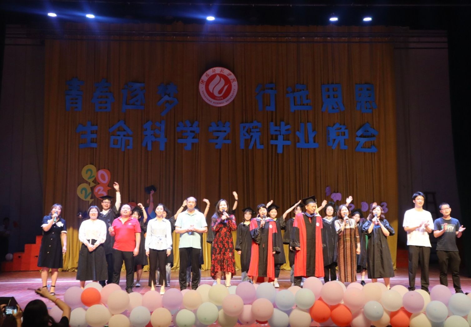 晚会开始前,毕业季主题视频在大屏幕上循环播放,记录着同学们四年来的生活点滴,也承载着学院师生温情满满的毕业祝福!随后,一段活力四射的开场舞《奔跑的青春》拉开了晚会的序幕。晚会分为三个篇章,节目涵盖舞蹈、歌曲、配音秀、小品、乐器表演等多种类型,生动呈现了生科学子积极进取、奋发向上的良好青春风貌。小品《我是理财小能手》、舞蹈《Youce》、走秀《寻梦,诗酒趁年华》、配音秀《你‘配’吗》、朗诵《毕业季,我们》等,或以诙谐幽默的故事激励广大学子惜时如金,勤勉奋斗,不负韶华,或以优美的舞姿表达着对母校的深情切意,或以动人的音符说着离别的不舍和对未来的期冀。晚会中,学院领导为优秀毕业生代表准备了拨穗仪式,寓意学有所成、扬帆启航。同时,老师们准备了惊喜节目—《那些花儿》,伴随歌曲旋律,每位同学被师生情谊所感染,大家共同合唱,深深表达了学院对毕业学子的美好祝愿和殷切期望。