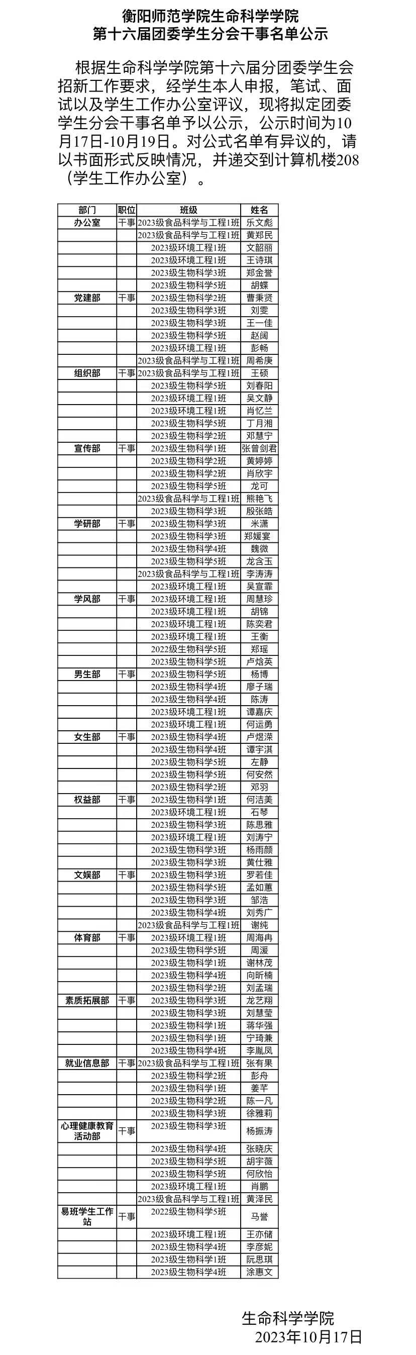 经个人竞演、学院选拔、团委讨论决定,招以下同学为第十六届团委学生分会干事,现将名单予以公示。