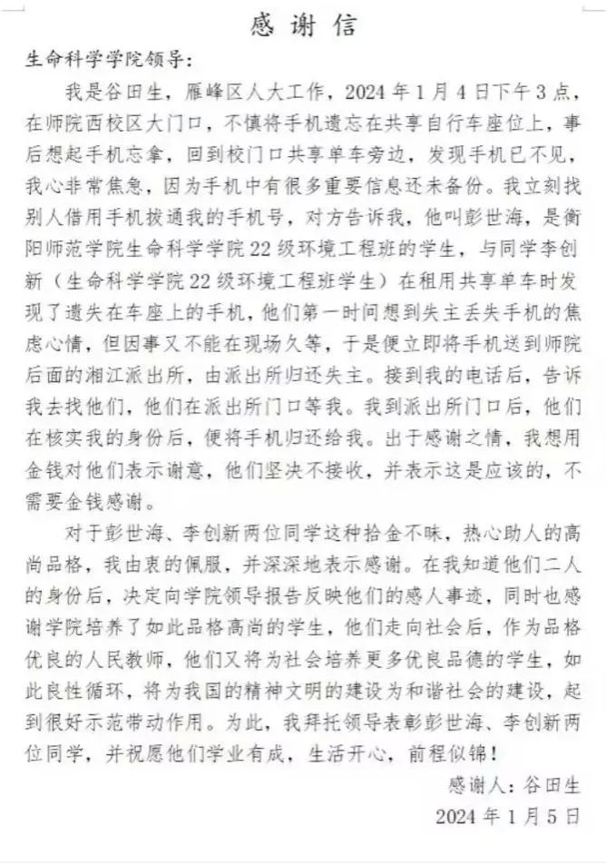 202414日下午3点,雁峰区人大工作的谷先生不慎将手机遗忘在SUNBET申搏官方网站西校区门口的共享自行车座位上,手机中有很多未备份的重要信息,谷先生借用他人手机拨通自己电话后得知,是申搏官网SUNBET申搏官方网站22级环境工程班的彭世海同学和李创新同学捡到了手机,并且已经将手机交于湘江派出所。谷先生在派出所门口见到这两名同学后,想用金钱表达感谢之情,但他们坚决不肯收下,并表示这是应该做的。