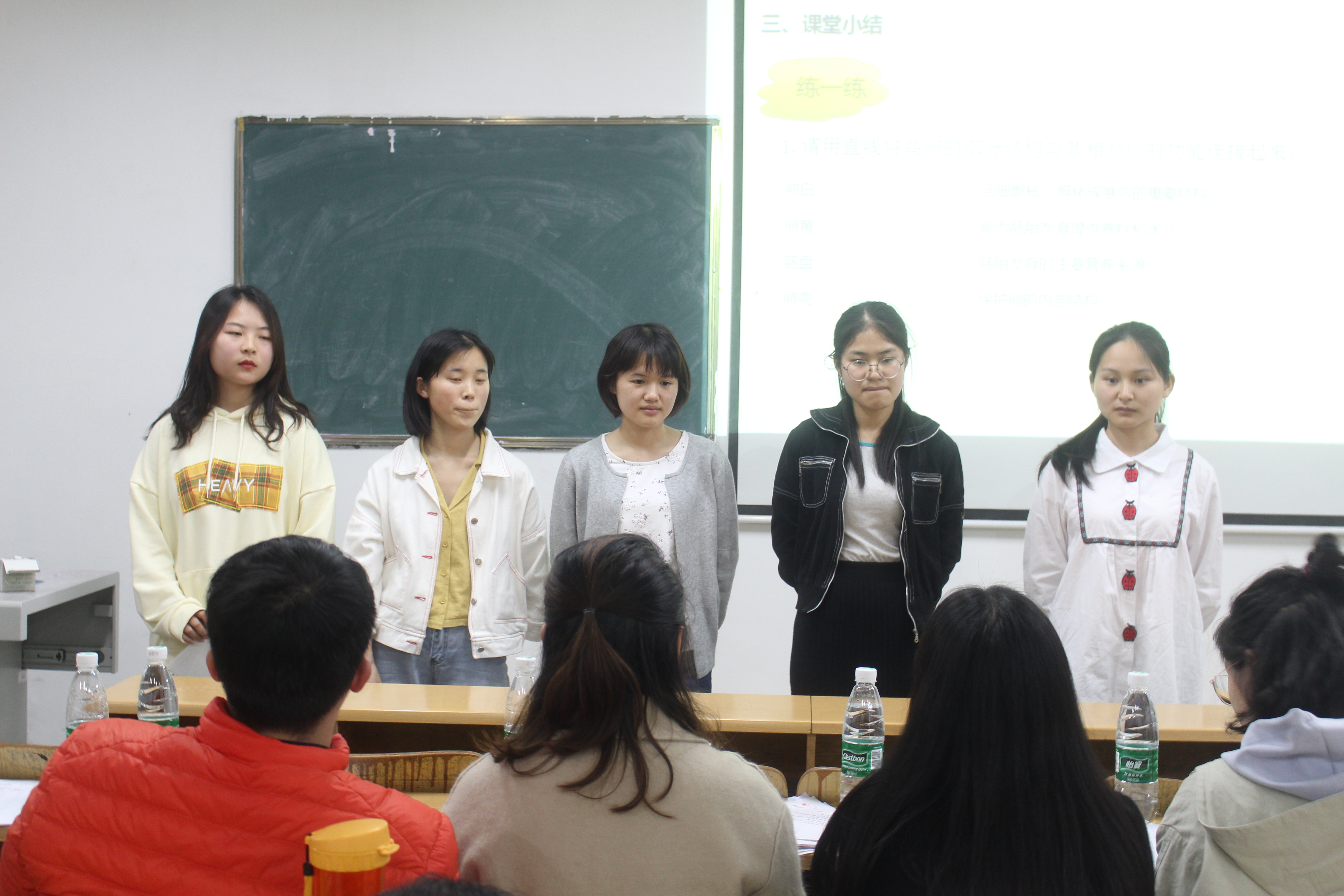 21日晚,16级9名学生参加了此次比赛。在片段教学中,1号选手罗洁用“双胞胎和龙凤胎所呈现出的性别差异”对“染色体的性遗传”一节内容设置了课前提问,以生活常识激发学生学习兴趣,大方的教态和良好的板书赢得了评委的一致认可。2号选手李飞菲将《毛毛虫与蝴蝶》歌曲作为新课导入,并在结尾举例、解释了传统古诗描述的自然现象,补充拓展教学内容。