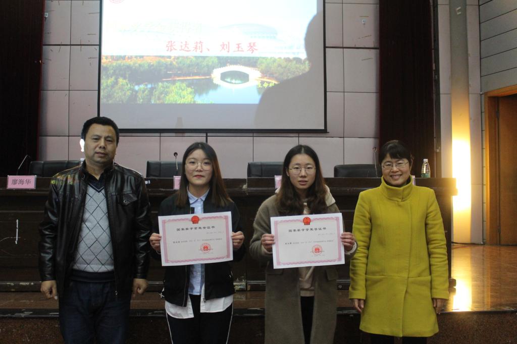 接着,副院长易诚宣读获奖名单,颁奖嘉宾为获奖学生颁奖。张达莉、刘玉琴2位同学获得国家奖学金;尹娜等25名同学获得国家励志奖学金;苏文璇获得“校优干标兵”称号,雷涵等63名同学分别被评为“校三好学生”“优秀学生干部”;陈怡,董琼等20位同学被评为“十佳卓越团学干部、班干部”,何丽等5名同学获“卓越寝室长”荣誉称号。