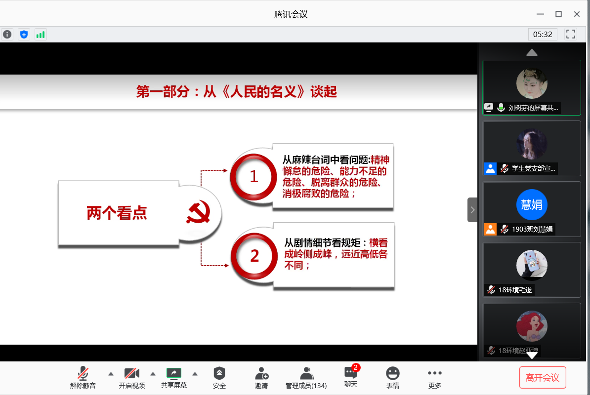 6月14日上午10时,刘树芬老师从反腐题材影视剧《人民的名义》切入,为大家剖析了中国共产党内部存在的消极腐败现象,通过分析贪污腐败违法者最终落入法网的结局,提出了中国共产党严厉的党规党纪,进一步强调了党规对于政党的重要性以及增强纪律观念、遵守党纪、弘扬党风的必要性。