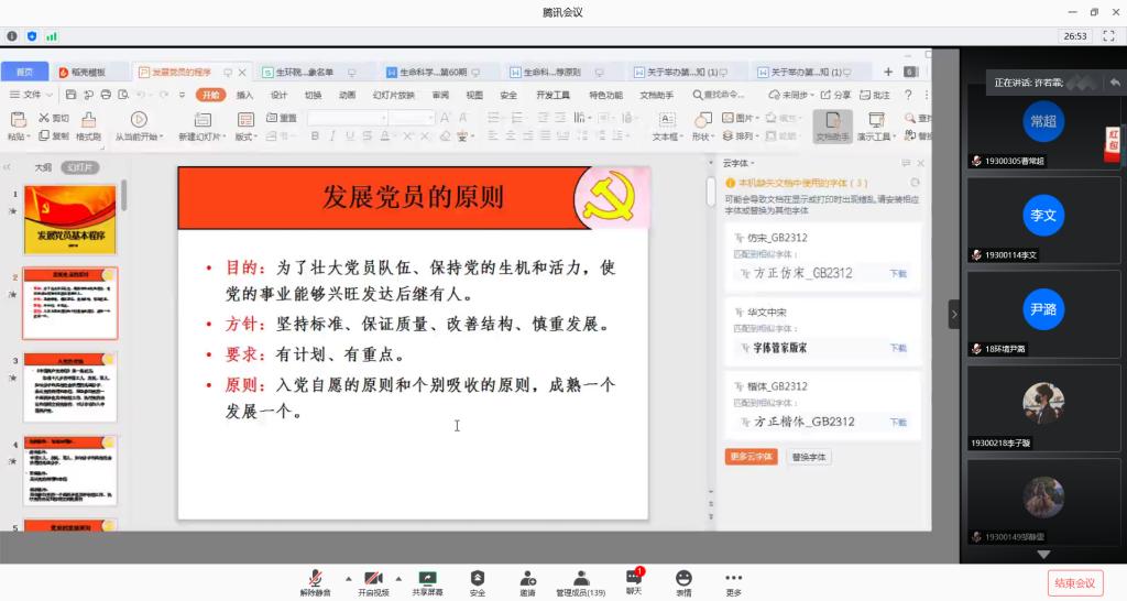 6月13日晚7时,许若霏老师结合推优入党的推荐原则与目前发展党员的实际情况,从“确定入党积极分子、培养考察、履行发展手续、预备党员转正”四个不同的阶段,给大家介绍了发展党员的基本程序。同时,她希望大家能够积极上进,多方面严格要求自己,积极向党组织靠拢,争取早日加入中国共产党。