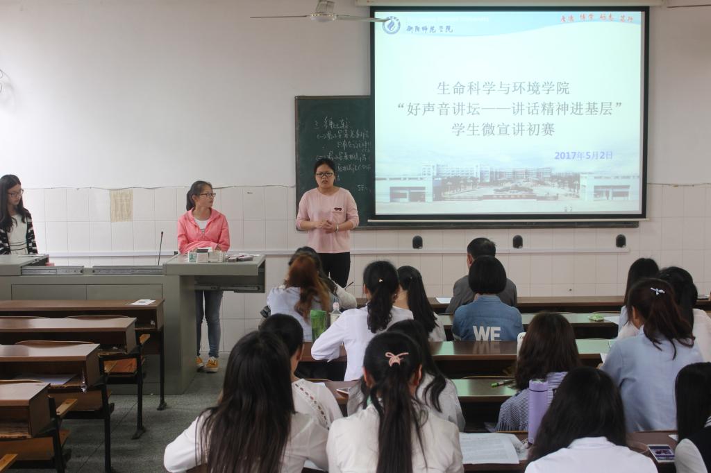 5月11日晚19时,“好声音讲堂-讲话精神进基层”师生微宣讲比赛学生组决赛在东校区音乐厅举行。生命科学与环境学院3支代表队结合自身学习和生活实际,用富有感染力的表达、鲜活真实的事例和充满激情的语言,从不同角度诠释对“习近平总书记系列重要讲话精神”的深刻理解,赢得了观众的热烈掌声。经过激烈地角逐,申搏官网15级生物科学1班荣获三等奖,15级生物科学2班、15级环境工程1班荣获优胜奖。