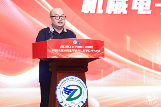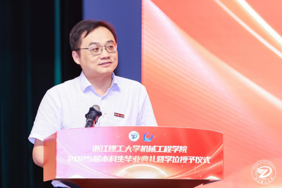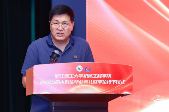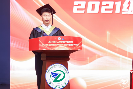 毕业生代表21机器人工程1班孙琦回顾四年点滴,以“你只管努力,剩下的交给时间”激励同窗无畏前行;教师代表刘宜胜教授以“匠心创造者”定义新时代机械人,嘱托学子以夯实的躯体、坚韧的精神、机智的脑袋、灵巧的双手开拓未来;校友代表叶文(77级丝绸机械专业校友、杭州纺织机械集团有限公司董事长、学院杭州校友会会长)结合创业历程,强调“无论志向多大,成功都需脚踏实地的努力”,勉励毕业生一步一个脚印走出辉煌。