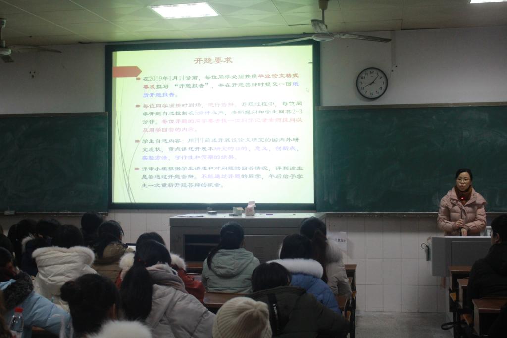 本次开题报告会由陈晓华老师主持。首先,她分别从开题内容、形式种类、撰写方法以及答辩时需要注意的问题等作了详细讲解。而后,她补充了使用实验室的要求及注意事项、实验用品的准备等方面向大家进行了详细地说明。
