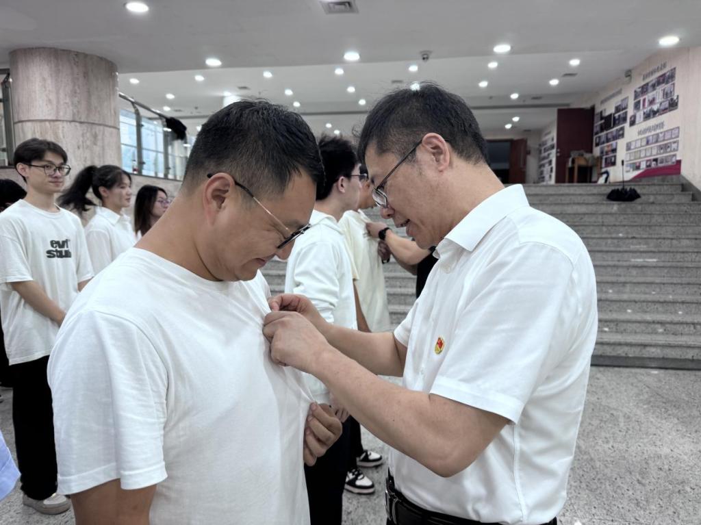 本年度共发展32名党员,其中教师2名,学生30名,在活动现场,苏志俭、鲁玉军、向忠及学生党支部书记代表为新发展的师生党员佩戴党徽,象征着党员的责任与使命薪火相传。